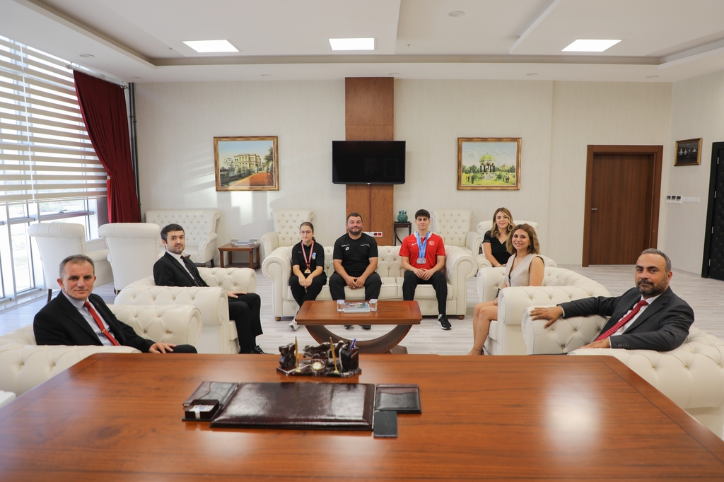 Chatting with the young athletes during the visit held at the Rectorate office, Rector Prof. Dr. Ahmet Akkaya congratulated Korcan Bulut Özdemir, Zeynep Alya Şahin, their coaches, and their families for their achievements.