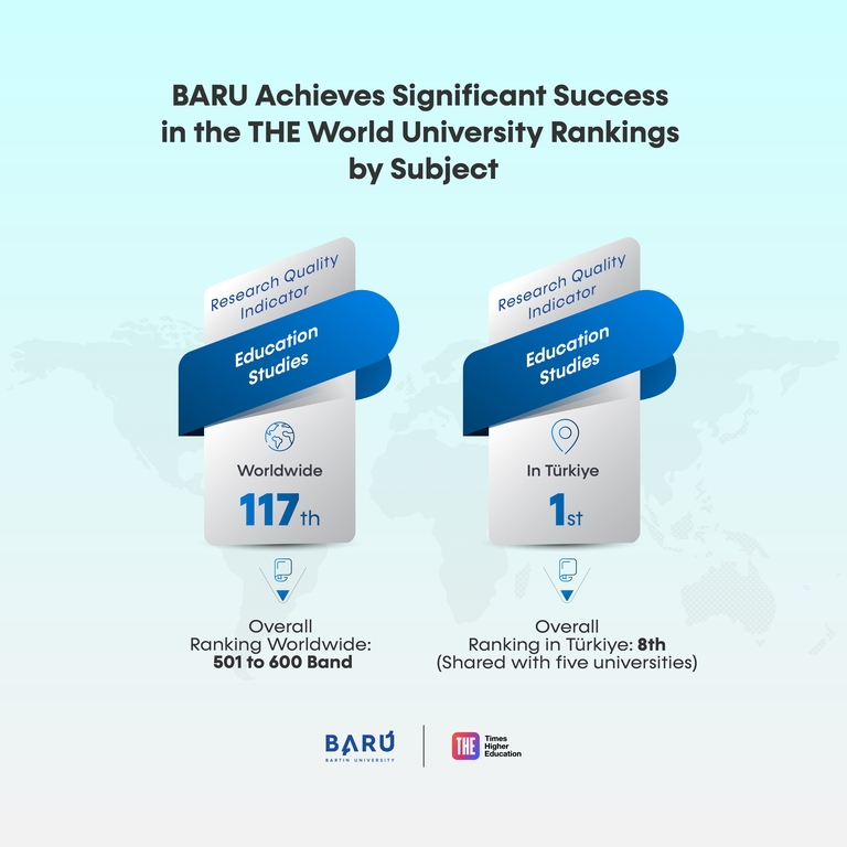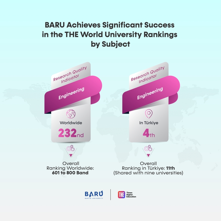 Bartın University (BARU) achieved a significant success in the Times Higher Education (THE) World University Rankings by Subject 2026. In the Research Quality indicator, BARU ranked 117th worldwide and 1st in Türkiye in the field of Education Studies, while ranking 232nd worldwide and 4th in Türkiye in the field of Engineering.