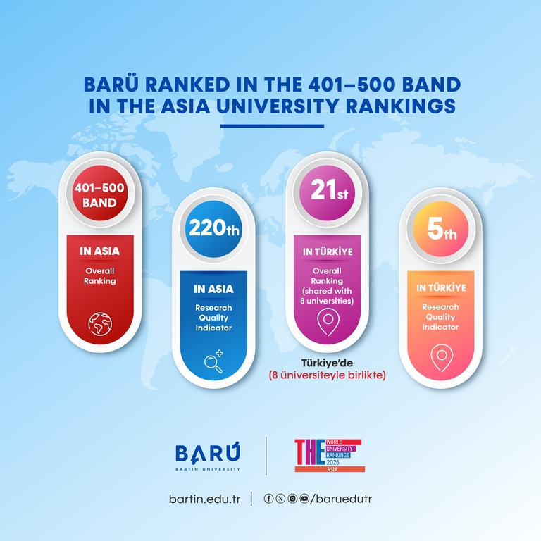 The “THE Asia University Rankings” evaluate institutions based on key performance indicators such as teaching, research quality, research environment, international outlook, and industry. According to the results, BARÜ was placed in the 401–500 band globally and ranked 220th in the “Research Quality” indicator. While sharing the 21st position in the overall ranking in Türkiye with eight universities, BARÜ achieved a notable success by ranking 5th nationally in the “Research Quality” category.