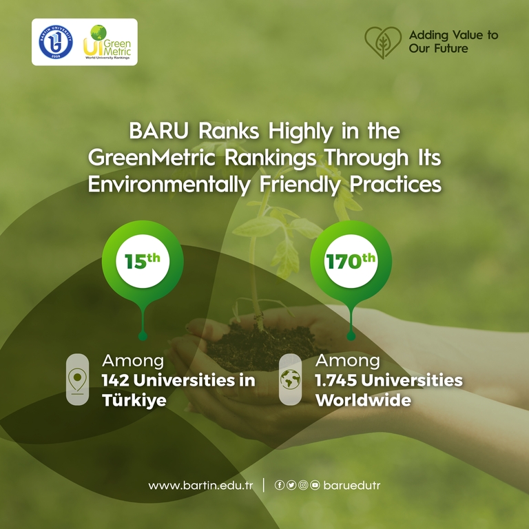 Bartın University (BARU) achieved a notable success in the 2025 UI GreenMetric World University Rankings, which evaluate sustainability and environmental performance. Among 1,745 institutions worldwide, BARU was ranked 170th globally and 15th in Türkiye among 142 universities.