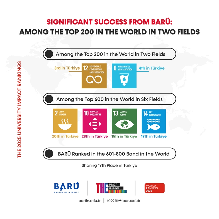 According to this list, in evaluations conducted under 17 subheadings, BARÜ ranked 97th globally in the "Responsible Production and Consumption" category in the 2025 Impact Rankings, ranking within the top 100. It also ranked 101-200th in the "Clean Water and Sanitation" category and 401-600th in the "Zero Hunger," "Reducing Inequalities," "Climate Action," and "Life Below Water" categories.